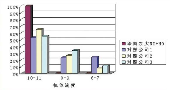 華南農業大學獸醫學院針對近年國內流行H9毒株和新城疫強毒作分析比較,挑選山東、河南、河北、廣西等 有代表性的禽流感H9N2病毒和新城疫強毒各近100株作為攻擊病毒,分別以上述病毒攻擊以用廣州市華南農大生物藥品有限公司精品系列油苗一ND+H9和國內其他廠家的疫苗免疫的試驗雞,計算發病雞數量,統計不同疫苗之間的保護率,發現廣州市華南農大生物藥品有限公司生產的精品系列油苗一ND+H9對上述攻擊野毒都有較好的保護作用。