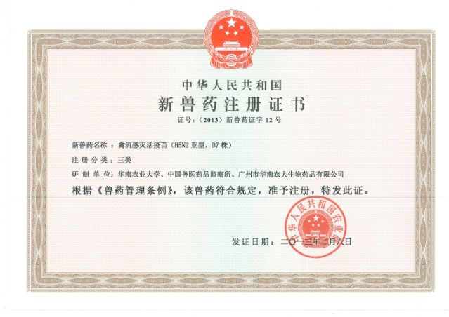 根據(jù)《獸藥管理?xiàng)l例》和《獸藥注冊(cè)辦法》規(guī)定,廣州市華南農(nóng)大生物藥品有限公司與華南農(nóng)業(yè)大學(xué)、中國(guó)獸醫(yī)藥品監(jiān)察所3家單位共同申報(bào)的禽流感滅活疫苗(H5N2亞型,D7株)通過(guò)了國(guó)家農(nóng)業(yè)部的審查,批準(zhǔn)為新獸藥。即將取得農(nóng)業(yè)部核發(fā)的《新獸藥注冊(cè)證書(shū)》,證書(shū)主要信息如下: