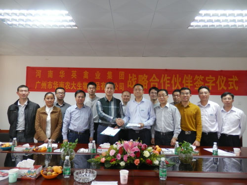 2014年3月28日下午4:30,河南華英禽業集團與廣州市華南農大生物藥品有限公司(以下簡稱“華南生物”)戰略合作簽約儀式在華南生物公司會議室舉行。河南華英禽業集團常務副總經理張家明、種鴨部副總經理余廣敏、生產技術部技術經理龔加根,華南生物公司梁昭平總經理等有關負責人參加了簽字儀式。