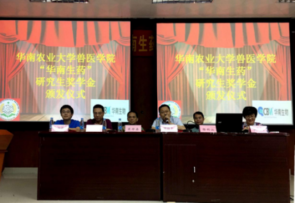2017年5月24日上午,廣州市華南農大生物藥品有限公司(下稱“華南生物”)在廣州華南農業大學獸醫學院開展了2017年“華南生藥”研究生獎學金頒獎典禮,同時進行了“創新中的華南生物及就業指導”課程分享。