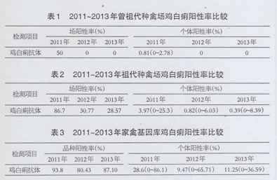 2011~2013年曾祖代、祖代種禽場(chǎng)和地方品系雞雞白痢陽(yáng)性率進(jìn)行比較(見表1、2、3)可見,曾祖代種禽場(chǎng)除了2011年檢測(cè)陽(yáng)性率較高外,2012~2013年檢測(cè)結(jié)果都比較好,陽(yáng)性率為0;祖代種雞場(chǎng)持續(xù)保持雞白痢抗體陽(yáng)性,但整體陽(yáng)性率處于降低的水平,局部雞場(chǎng)可能出現(xiàn)了反彈;家禽基因庫(kù)雞白痢抗體陽(yáng)性率保持在很高的水平。雞白痢抗體陽(yáng)性率整體處于下降水平,但是在這些種雞群中存在ALV、REV等不同病原的兩重或多重感染。